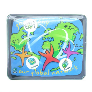 Airtight liquid-filled mouse pad. With company icon floating inside.
